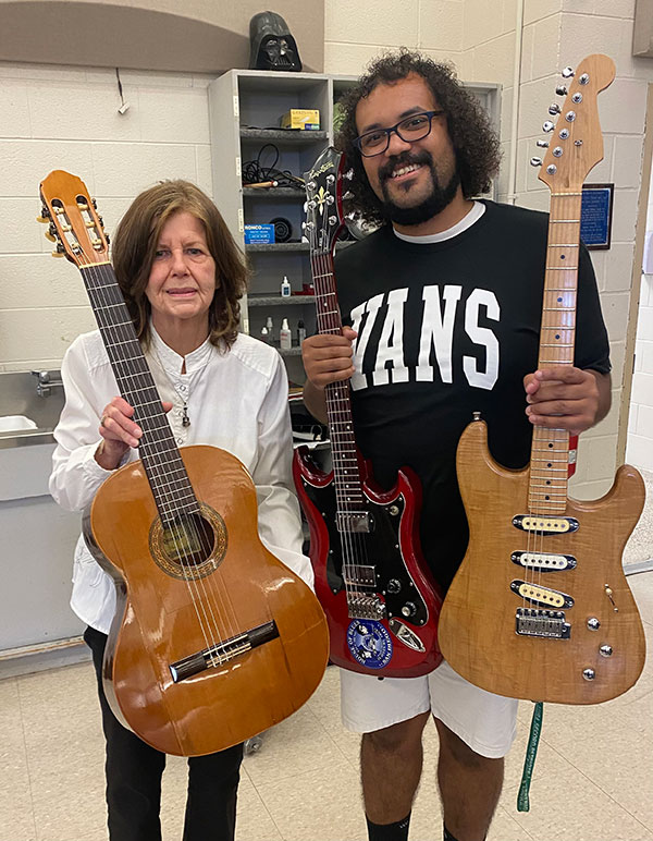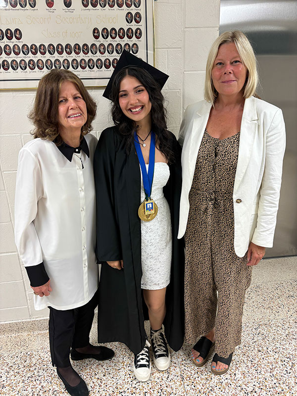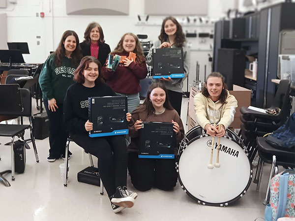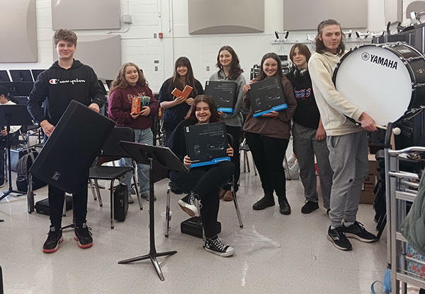 The Dave Curry Memorial Music Fund recently added assistance to The Laura Secord SS. Music Program with a $4600.00 purchase of equipment the was needed by the students. Items donated and paid for by DCMMF from Long & McQuade St. Catharines added a marching bass drum, Sennheiser Wireless head sets, saxophone and clarinet mouthpiece sets, saxphone and clarinet reed kits and a powered speaker. Pictured are Denise Curry, DCMMF coordinator, music teacher Katryna Sacco with students displaying the equipment added to their music program inventory. Photos courtesy of Robyn Rouse